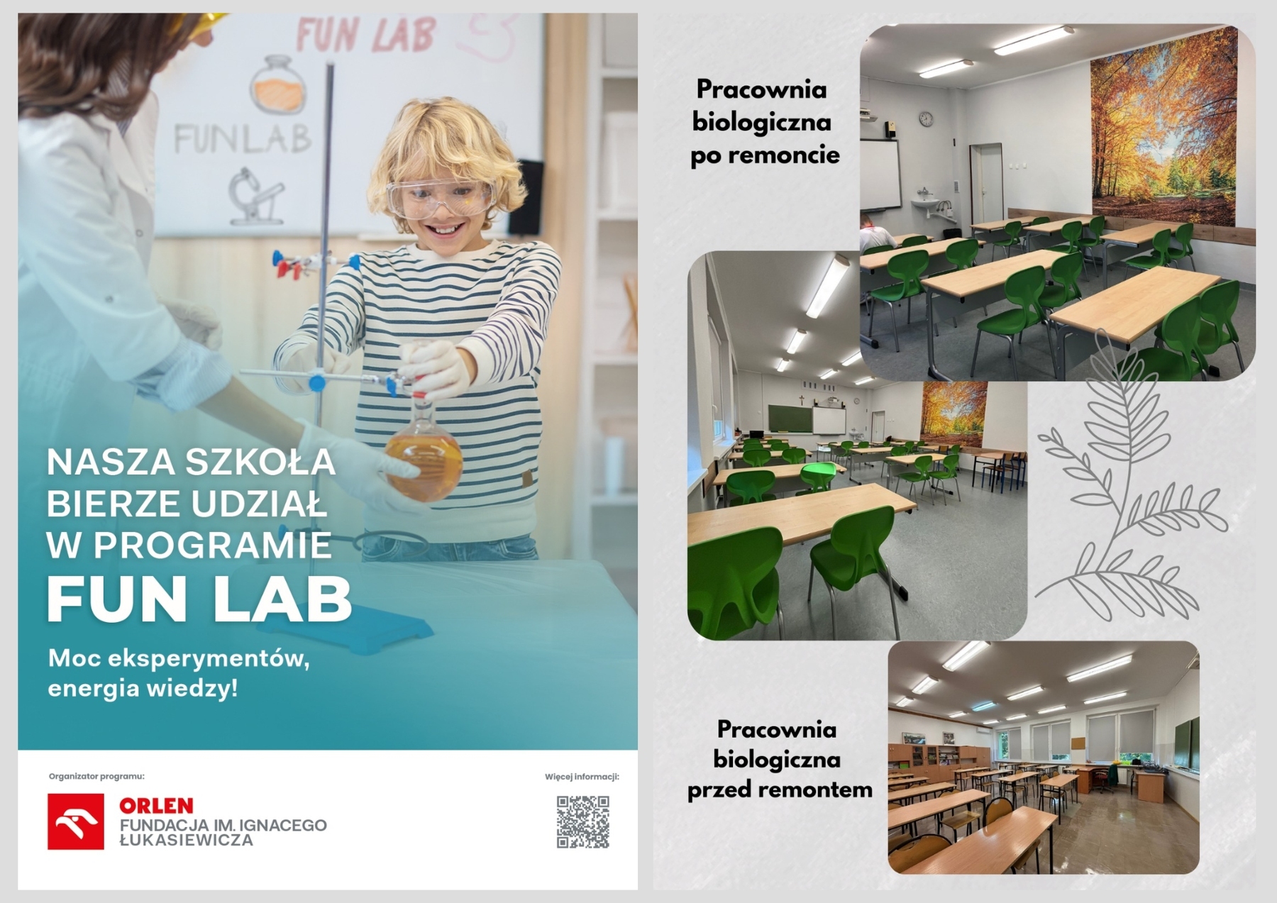 W ramach programu grantowego FUN LAB realizowanego przez Fundację PGNiG z Grupy ORLEN nasza szkoła otrzymała nowoczesną pracownię biologiczną. Pozwoli ona na prowadzenie badań i analiz jakości wody, gleby i powietrza, obserwacji mikroskopowych oraz doświadczeń przyrodniczych. Projekt stanowi inwestycję w przyszłość – wspiera rozwój uczniów i kształtowanie odpowiedzialnej, świadomej ekologicznie społeczności.